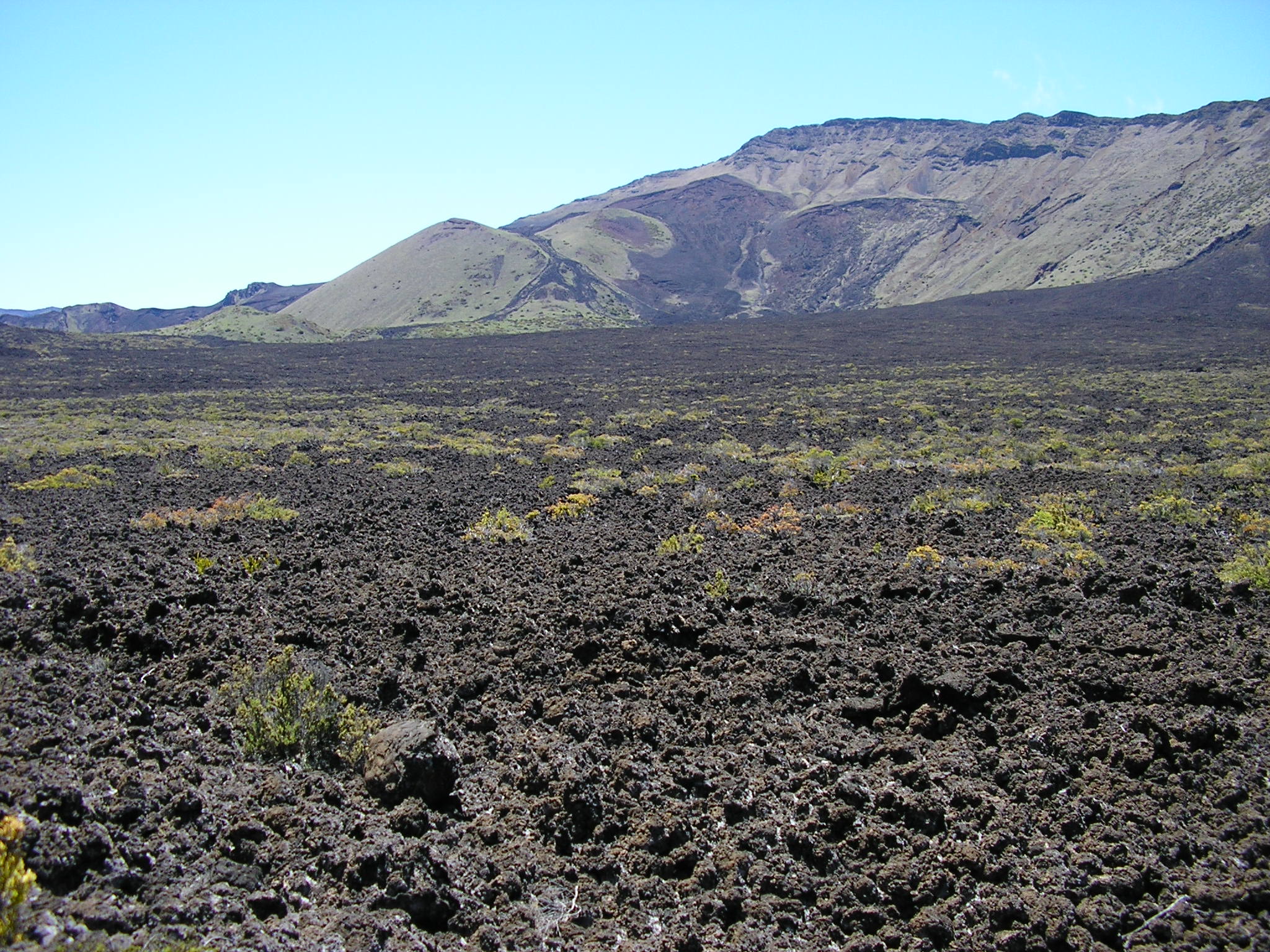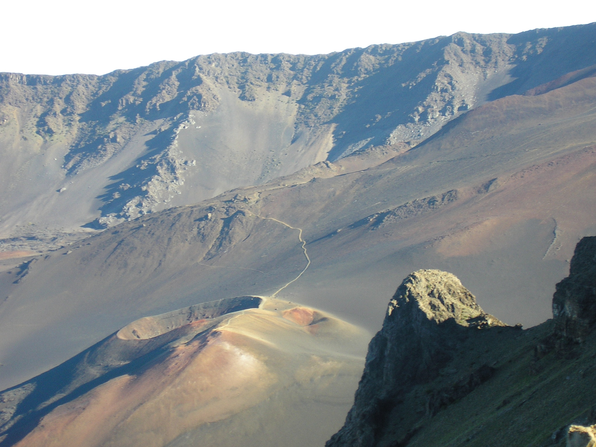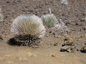 The first day we hiked nearly 10 miles east from the Visitor’s Center to Paliku, the crater’s “best” cabin. The first five miles slogged off the summit through Sliding Sands trail, raising clouds of lava dust with every step. Our sneakers filled with cinders. Our rental gear chafed, our sleeping bags flopped around, and spouse’s pack was too big for her torso. We started with 30 mph winds (gusting to 50) and 50 degrees but the wind soon died and the sun began to bake. The terrain descended over 3000 feet in a few miles through switchbacks into sun-blasted & eroded landscape punctured by occasional thousand-foot cinder cones and sporadic groups of silverswords. We saw no critters above 7000 feet– they’re not stupid.