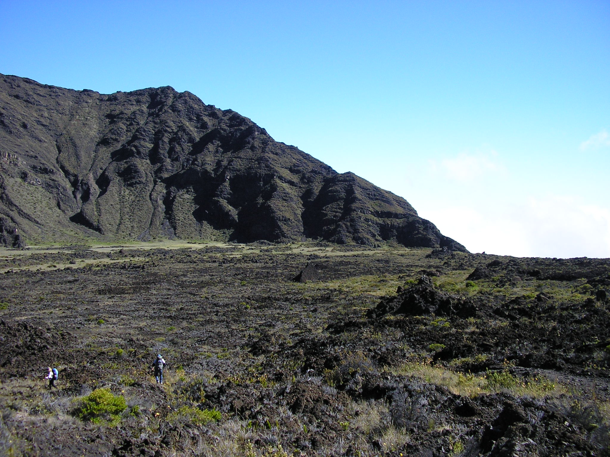 Haleakala’s altitude is from 6500-10,000 feet. It’s mostly desert and lava fields with some alpine meadows. The night before we hiked in, a cold front passed through with gusts over 75 mph. Summit winds are 20-30 mph and temperatures are 40-70 degrees even without the wind chill. The sun is intense and the altitude inhibits conversation, let alone exertion. The trails are unpredictably treacherous– ankle-deep sand, slippery rocks, sharp lava, narrow deep-cut trails, and crumbly switchbacks. The Apollo astronauts used the crater for lunar environmental training.