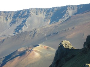 We survived, but it wasn’t pretty. I haven’t been so physically challenged since my taekwondo black belt test. Four days of Haleakala felt like three weeks of Army Airborne parachute training or Navy diver school, although I’m a bit older since those days. Spouse felt hammered down into pain levels somewhere between “plebe summer” and “giving birth”. Our critical asset was obstinacy perseverance, and it’s not hard to find when the alternative is dying of exposure. If you sprain an ankle in the crater it may literally take a day to get you out. There’s no cell-phone service, no cabin phones or electricity, and no standby rescue helicopter. If the weather closes in then the rangers use pack horses.