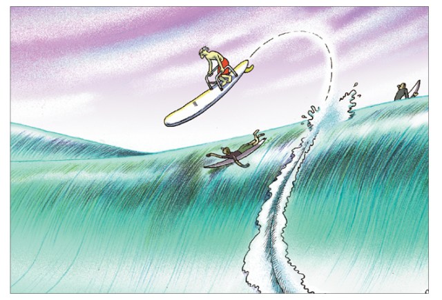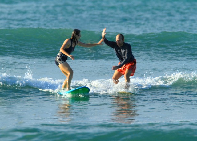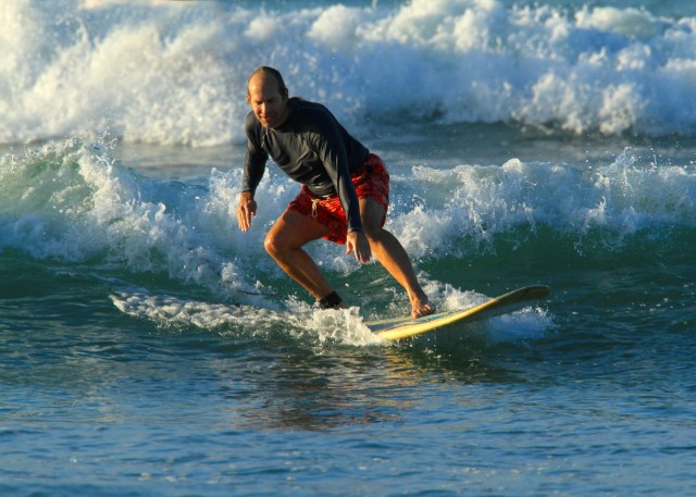 This month our daughter was home from college for 18 days, and we managed to go surfing for eight of them. She’s been working out for an entire year with her NROTC unit’s Marine gunny sergeant, so she’s in excellent surfing shape. I was doing fine for the first six or seven sessions, too, but it turns out that my muscles no longer recover as quickly at age 50 as they did at age 18. Two words of advice for you more experienced surfers: afternoon naps.