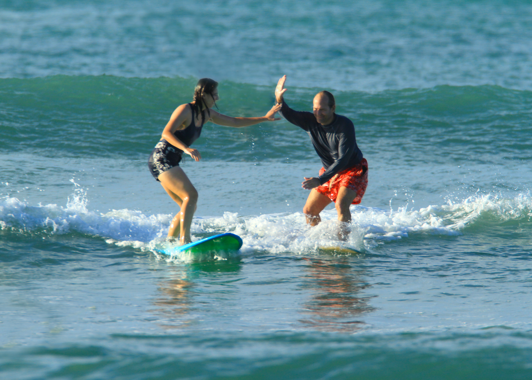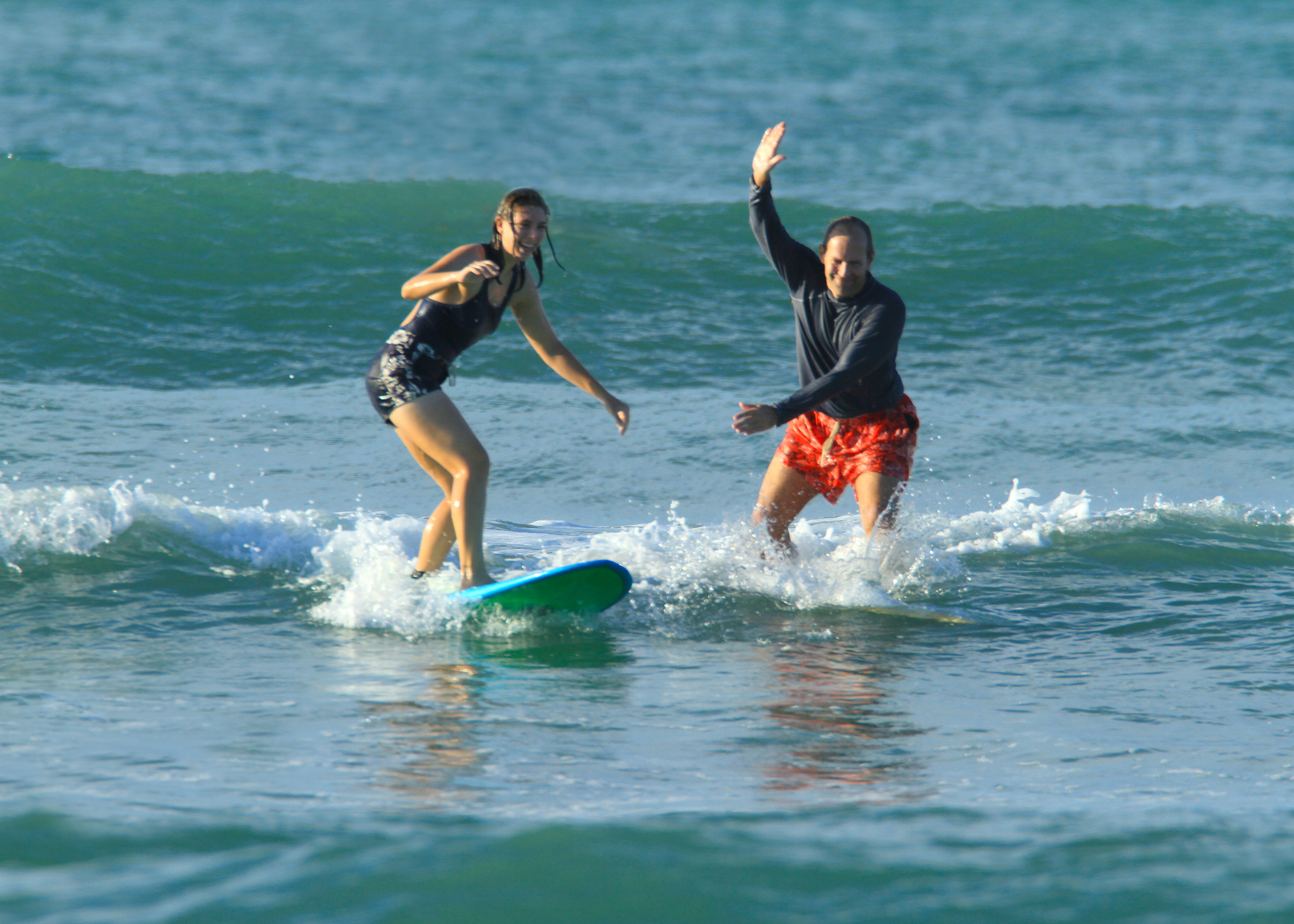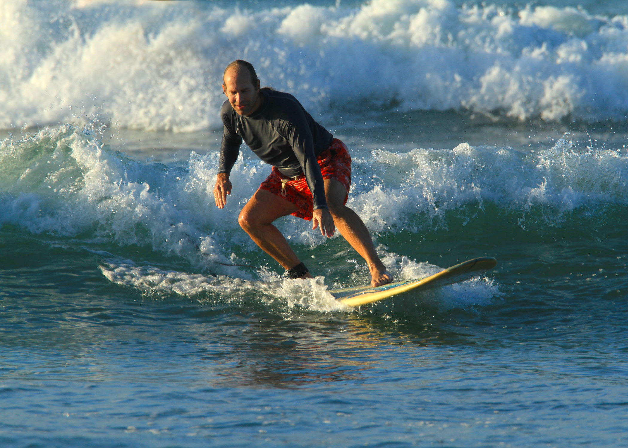By the end of the first week I knew I was in an endurance contest against my own muscles. To quell my incipient attitude of “Oh, gosh, surfing again?!?” I decided to give myself a new goal. For the last five years my daughter and I have tried to get good pictures of each other on the waves, but it’s not easy to sit out there in the waves and take care of you, the board, and the camera all at once. So after years of reader requests (and growing skepticism), I finally went and did it: professional surfing pictures. “Professional” refers to the photographer, not the surfer. More about the photographer in a few paragraphs, but first let’s look at the pictures.