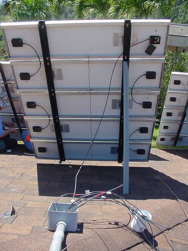 In late 2005 we found four decade-old 50-watt panels on Craigslist at $4/watt. Even better, we discovered that Evergreen Solar was selling blemished panels through eBay. The panels had broken junction wires and discolored solar cells but they had been over-engineered to still deliver rated voltage & power. I put an eBay “Buy it now” $7000 PayPal transaction (*gulp*) on a credit card to buy 16 110-watt panels. (Today’s panels are nearly three times more powerful.) It even included shipping & handling from Florida to Oahu. At less than $4/watt, the panels compared favorably to the local market’s $6-$8/watt. (Today they’d cost about 75 cents/watt.) We made more rails and brackets using scrap aluminum and mounted the panels on our roof. Following the procedure that we learned from the electrician, we wired them in series and connected them at the junction box as a second string for a total of just over three kilowatts.