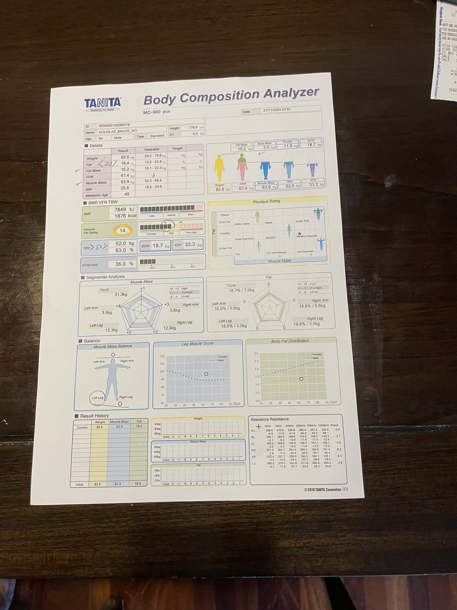 This was my first-ever body composition analysis, and I’m sure they threw in some feel-good vibes. The analysis claims that my metabolic age is a whippersnapper 49 years old. The rest of this image can be summarized as “surfing muscles.”