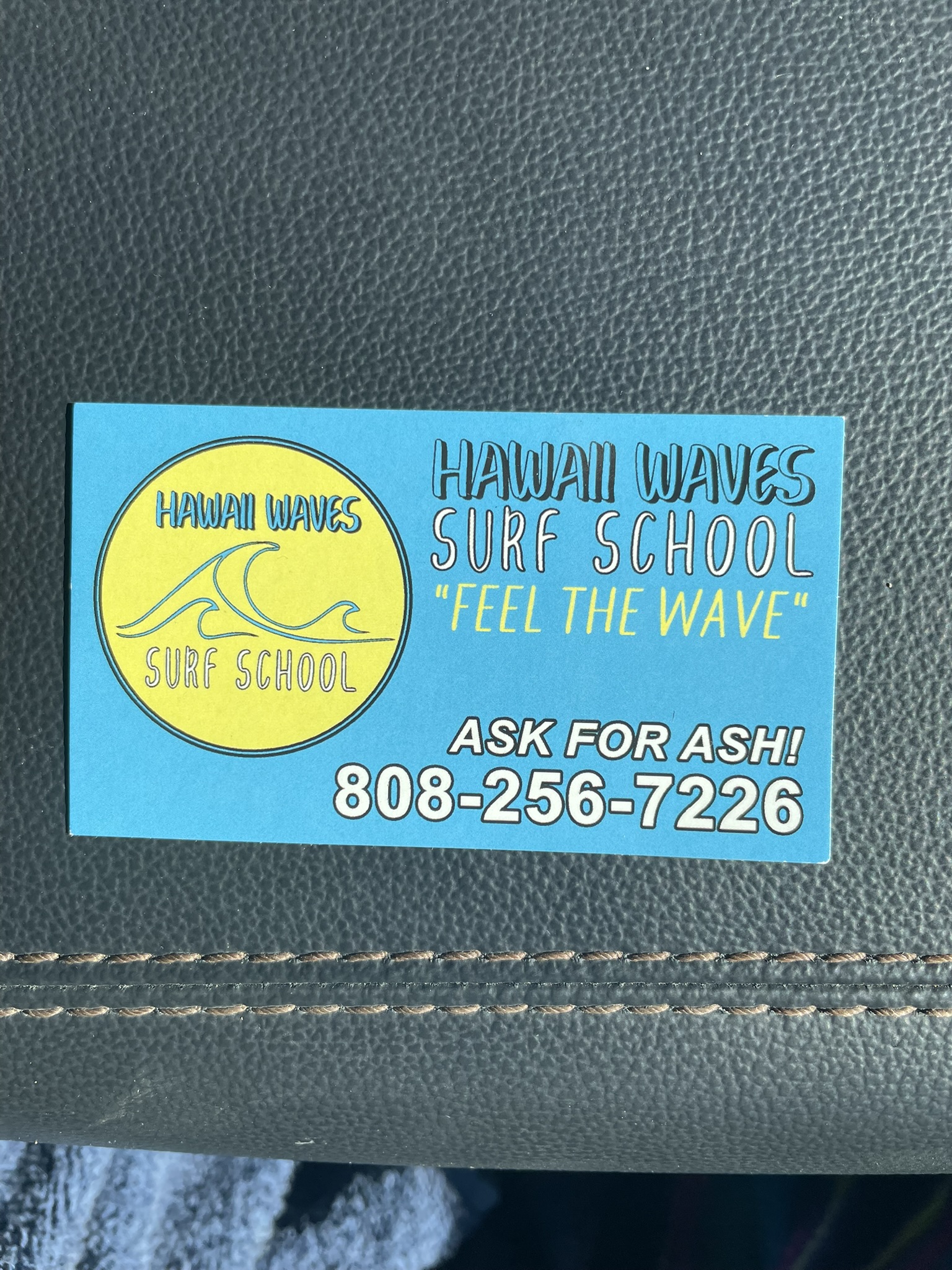 As I paddle out there, I also enjoy watching Ash teaching new surfers. Last weekend I finally got his contact info (see the photos): HISurfSchool.com and 808-256-7226. He’s one of the best instructors I’ve seen (and I’ve seen a lot of them) and he’s also fun to watch. When I pass his new surfers on the inner break, you can practically feel the stoke radiating off of them… or maybe they’re just enjoying my usual goofy grin.